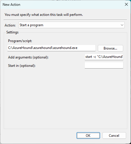 1. On the New Action window, select Start a program, then Browse… to the location of AzureHound with the config file for that Azure tenant. Modify the following argument to match the location of the appropriate config.json, then fill in the Add arguments (optional) field, and click OK.