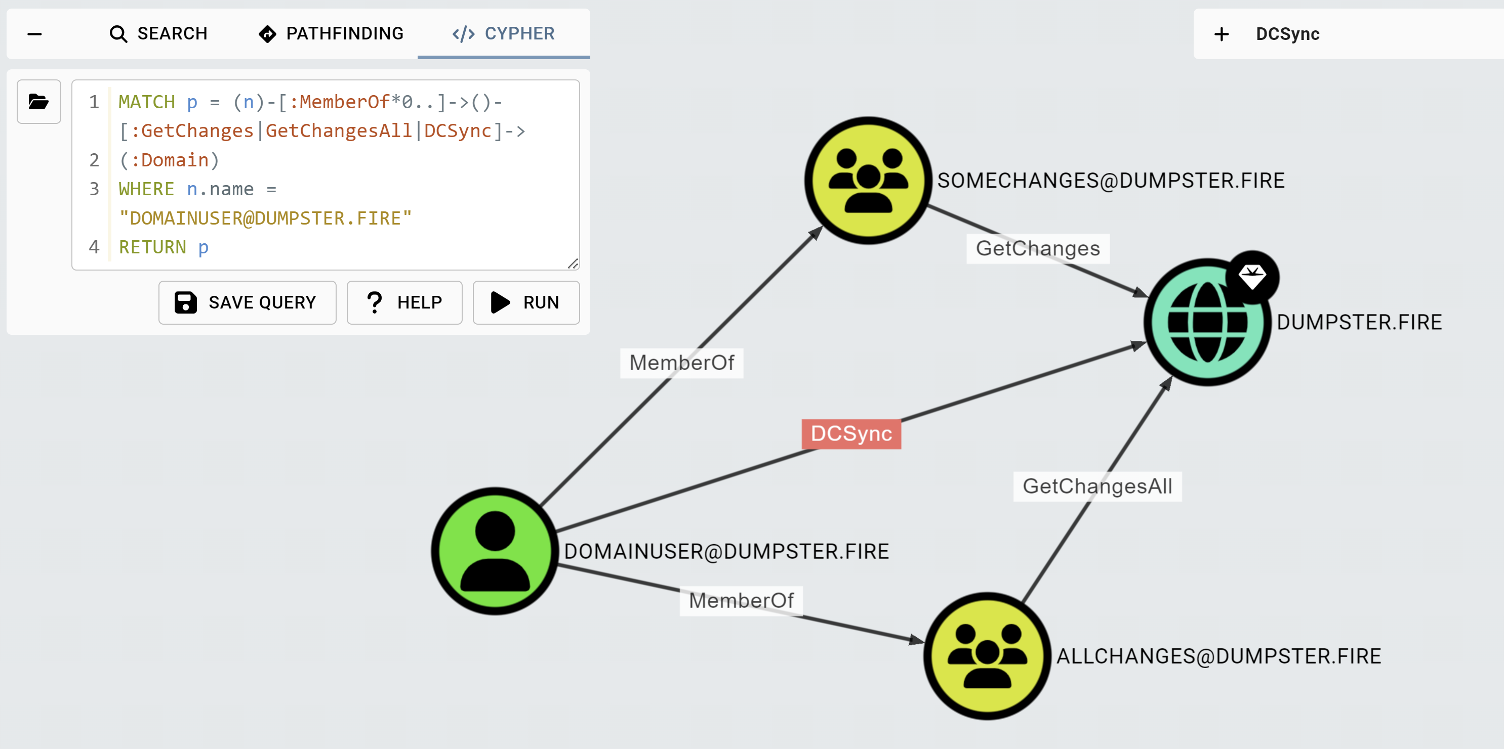 If you cannot abuse a given relationship between two nodes to take control of the end node, then the relationship is non-traversable. However, some non-traversable relationships can form a traversable relationship when combined. An example is the DCSync attack narrative. GetChanges and GetChangesAll permissions on the domain object combined enable you to perform the DCSync attack. GetChanges and GetChangesAll are non-traversable edges, and BloodHound uses them to produce the traversable DCSync edge in what we call the post-processing logic. Pathfinding includes only traversable edges. As a result, you might get a DCSync edge in a path like this: