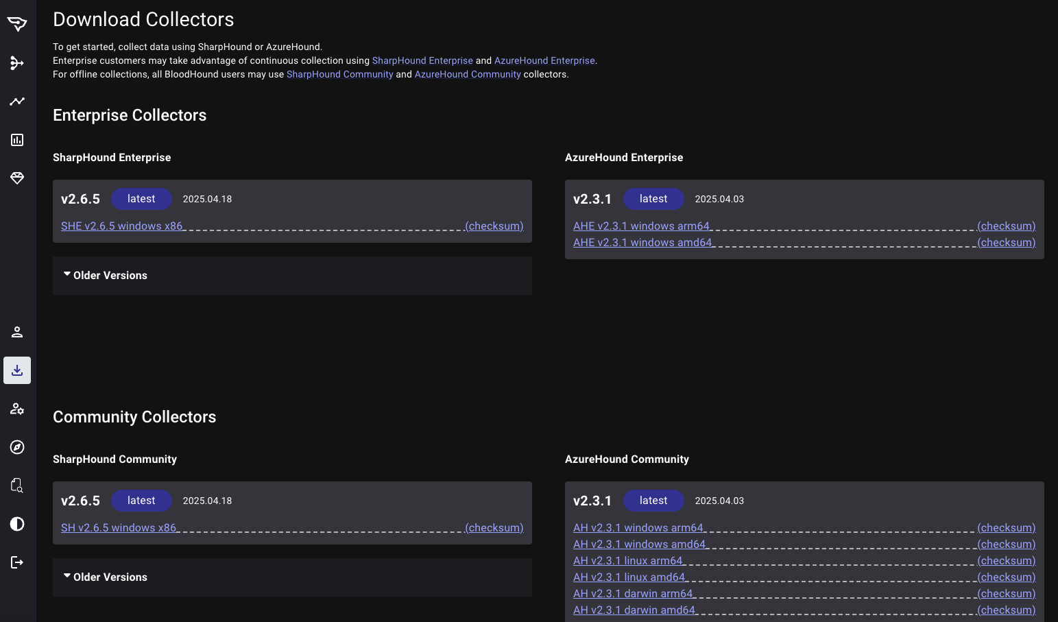 - [BHE Only] New Collector Downloads page - Long overdue for an upgrade, the BloodHound Enterprise Collector Downloads page is brand new. This new page adds several functional enhancements for all customers, including:\